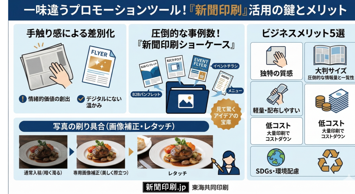 新聞印刷が販促ツールとして選ばれる理由やメリット、プロモーションの要となる「写真の仕上がり」を向上させる秘訣、そして多数の制作実績が見られる「新聞印刷ショーケース」についてご紹介します。
